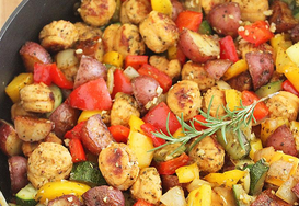 - Move sautéed mixture to one end of skillet, add sausage to other end and brown the sausage. Turn both mixtures separately as needed.